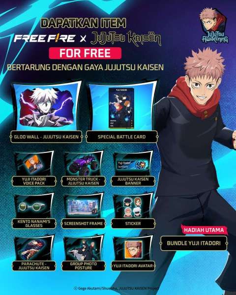 Menariknya lagi, pemain FF bisa mendapatkan hadiah utama Bundle Yuji Itadori secara gratis!