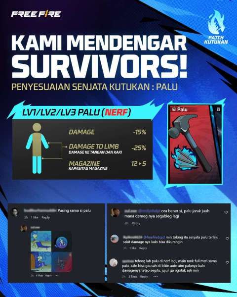 Kabar baiknya, Garena mendengar keluhan player atas senjata Palu yang meresahkan ini. Melalui unggahan di akun media sosial resminya, Garena mengumumkan bahwa Senjata Kutukan: Palu terkena nerf.